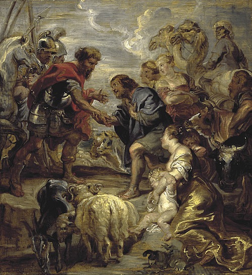In Genesis chapter 34 Jacob and Esau meet again! I found verses 5 through 7 interesting. Jacob presents his concubines and sons first – then Leah and sons – and then Rachel and Joseph. I read a commentary that he was keeping his favorite wife and son back, as the last presentation to Esau – just in case anything should go wrong with Esau and the introductions of his family… Meaning, if any violence erupted – Rachel and Joseph would hopefully be removed from it. Below is an image of Esau and Jacob meeting in verse 4: “Then Esau ran to meet him and embraced him affectionately and kissed him. Both of them were in tears.” Below is Flemish Baroque painter Peter Paul Rubens’ “The Reconciliation of Jacob and Esau,” from the year 1624: