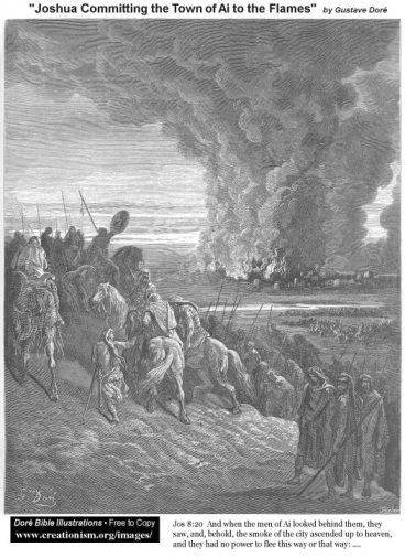 Now that we are just past the Pentateuch in our readings – the first five books in the Old Testament – verses like 34 & 35 stand out to me as God’s covenant is renewed with the Israelites – “Joshua then read to them all the blessings and curses Moses had written in the Book of the Law. Every command Moses had ever given was read to the entire assembly, including the women and children and the foreigners who lived among the Israelites.” After our recent readings about the Israelites victories at Jericho and Ai, I am not surprises by Joshua chapter 9 verse 2 at all…. – “These kings quickly combined their armies to fight against Joshua and the Israelites.” Seems like a logical idea to try to band together. We get some interesting tactics coming from the Gibeonites in tomorrow’s readings. Stay tuned! Below is nineteenth century French artist Gustave Dore’s take on today’s readings about Ai:
