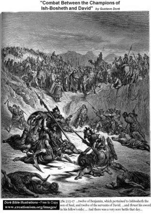 Second Samuel 19 is great! David returns to Jerusalem! I love the entire flow of today’s readings as David crosses the Jordan River toward Jerusalem and shows incredible kindness to Shimei, Mephibosheth, and Barzillai along the way. However, don’t forget the name Shimei just yet – the “rock thrower & curser” when David fled Jerusalem a few chapters back… On David’s deathbed, later in our readings in First Kings 2:9, David will pass along to his son Solomon these instructions: “Bring his (Shimei’s) gray head down to the grave in blood…” But, this day was not a day of bloodshed, but a day of amnesty, as David exclaimed in 2 Samuel 19:22 today: “This is not a day for execution but for celebration! I am once again the king of Israel!” An image of Mephibosheth, Saul’s grandson, meeting David on his return to Jerusalem is below: