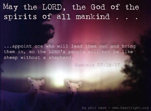 Please join us in memorizing and meditating on two verses of Scripture today:“May the LORD, the God who gives breath to all living things, appoint someone over this community to go out and come in before them, one who will lead them out and bring them in, so the LORD’s people will not be like sheep without a shepherd.” Numbers 27:16-17 NIV